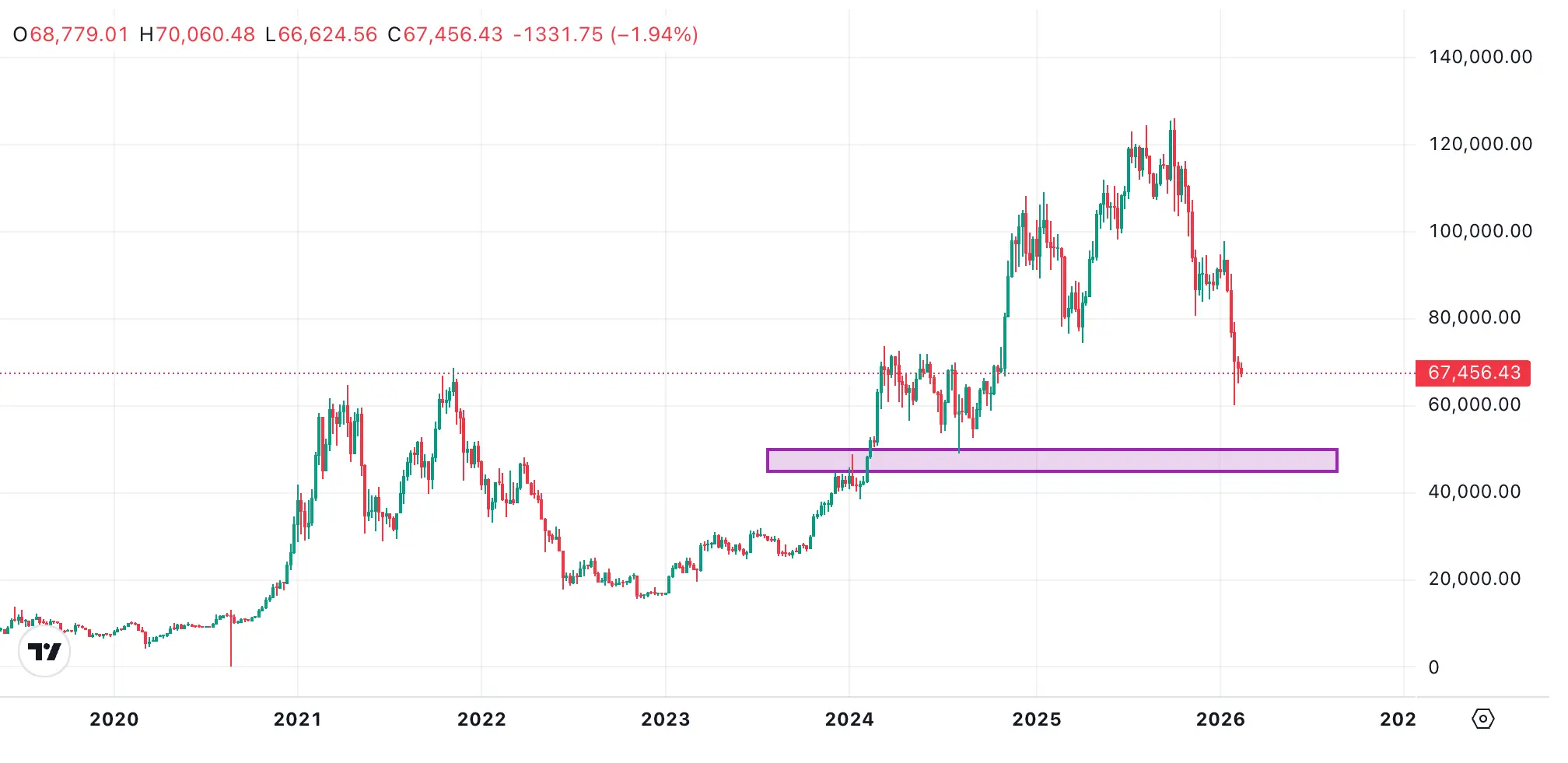 Based on the pattern, a 65% to 75% drawdown from the peak would put Bitcoin somewhere between $44,000 and $50,000. That's my target zone. That's where the real bottom will be. Not here at $67,000 where people still have hope.